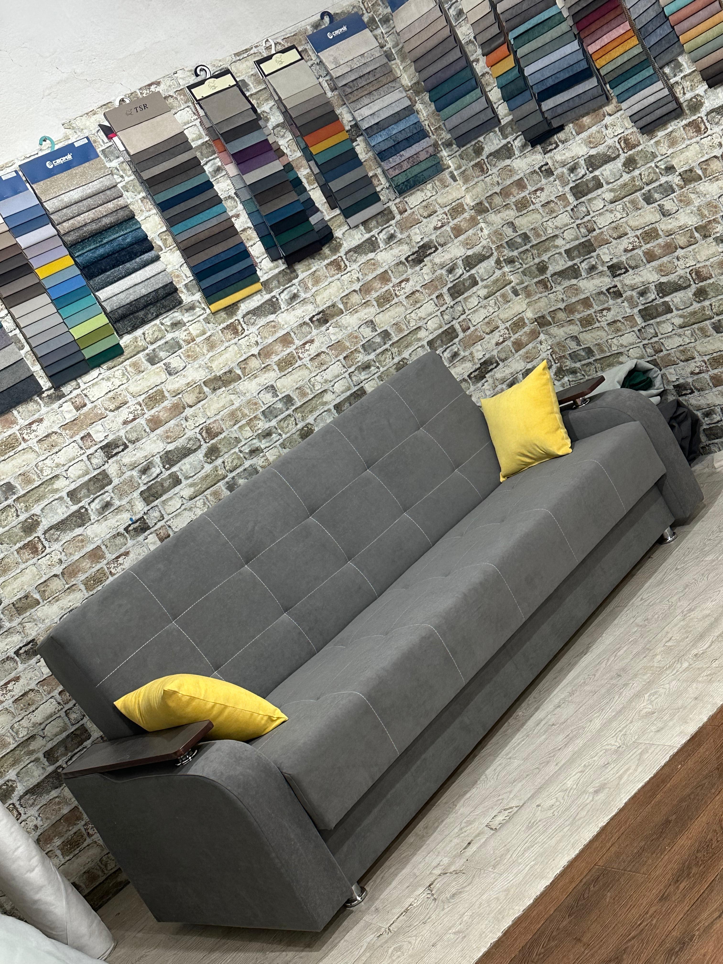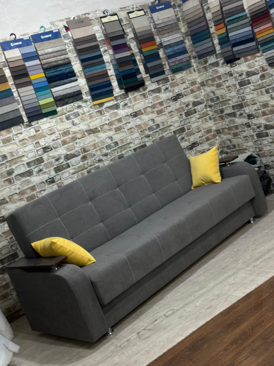 При Вашем желании можно изменить дизайн и ширину подлокотников. Также можно установить ламинат (утопленный вариант, наложение и на хромированных трубках). Диван Книжка это один из самых распространенных видов диванов. Он пользуется популярностью из-за своего удобства, долговечности и приемлемой цены. Он легко может трансформироваться в кровать-кушетку и обратно с помощью простого шарнирного механизма. Диван имеет вместительный ящик для хранения белья. Данную модель можно заказать по Вашим размерам и пожеланиям (изменение длины и ширины спального места. Также возможно изменение наполненияПенополиуретан, или Независимый пружинный блок. А множество вариантов расцветки тканей, представленных в разделе Ткани. позволит подобрать диван исходя из ваших индивидуальных предпочтений.